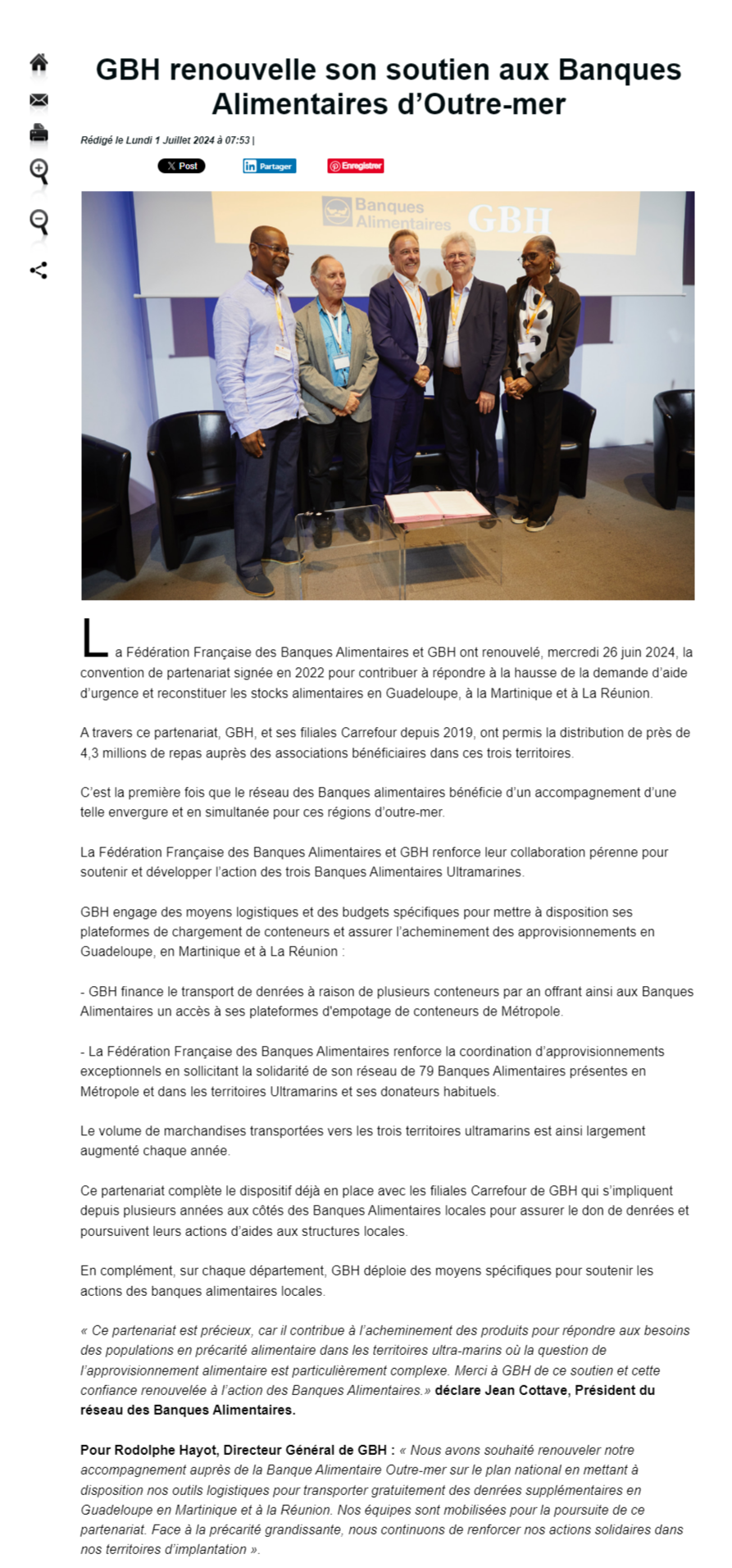 La Fédération Française des Banques Alimentaires et GBH ont renouvelé, mercredi 26 juin 2024, la convention de partenariat signée en 2022 pour contribuer à répondre à la hausse de la demande d’aide d’urgence et reconstituer les stocks alimentaires en Guadeloupe, à la Martinique et à La Réunion.