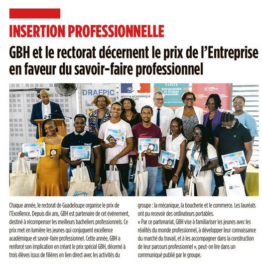 GBH s’associe au Rectorat de Guadeloupe pour rapprocher l’école du monde de l’entreprise et favoriser l’insertion des jeunes. Depuis près de 10 ans, GBH est partenaire du « Prix de l’Entreprise », organisé chaque année par le Rectorat pour récompenser les meilleurs bacheliers professionnels. Ce prix met en lumière les jeunes qui conjuguent excellence académique et savoir-faire professionnel.