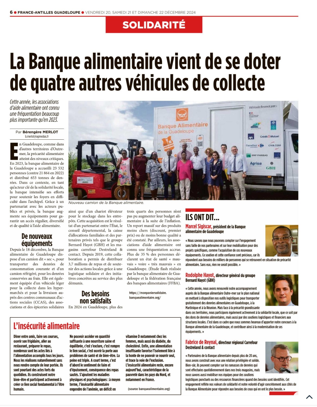 Aux côtés des partenaires publics (la Préfecture de la Guadeloupe, le Conseil départemental, la Caisse d’Allocations Familiales de Guadeloupe, la Fédération Française des Banques Alimentaires) et d’autres partenaires privés (la CMA-CGM, le Crédit Mutuel de Guadeloupe, le mécénat privé de la FFBA : AGRIA, AXA Paris et BNP PARIBAS), GBH et ses filiales Carrefour Destreland & Contact mais aussi la concession SGDM ont apporté un soutien décisif à la Banque Alimentaire de Guadeloupe pour l’acquisition de ces nouveaux équipements :