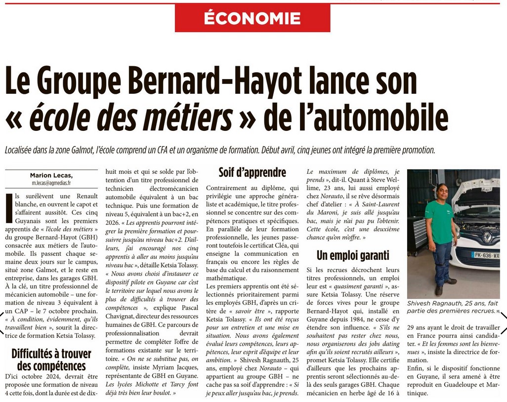 Rodolphe Hayot, Directeur général de GBH : « Nous sommes très attachés à la formation et à l’insertion professionnelle des jeunes. C’est avec conviction que nous proposons cette nouvelle offre de formation, avec l’appui de nos filiales, pour répondre aux besoins croissants dans des secteurs en tension. Avec cette première école, nous sommes très heureux de contribuer à l’insertion des jeunes en Guyane dans le secteur de l’automobile ».